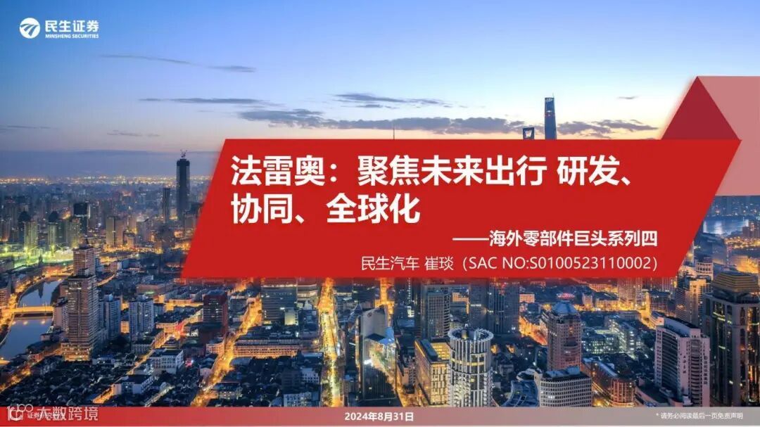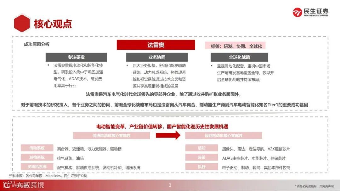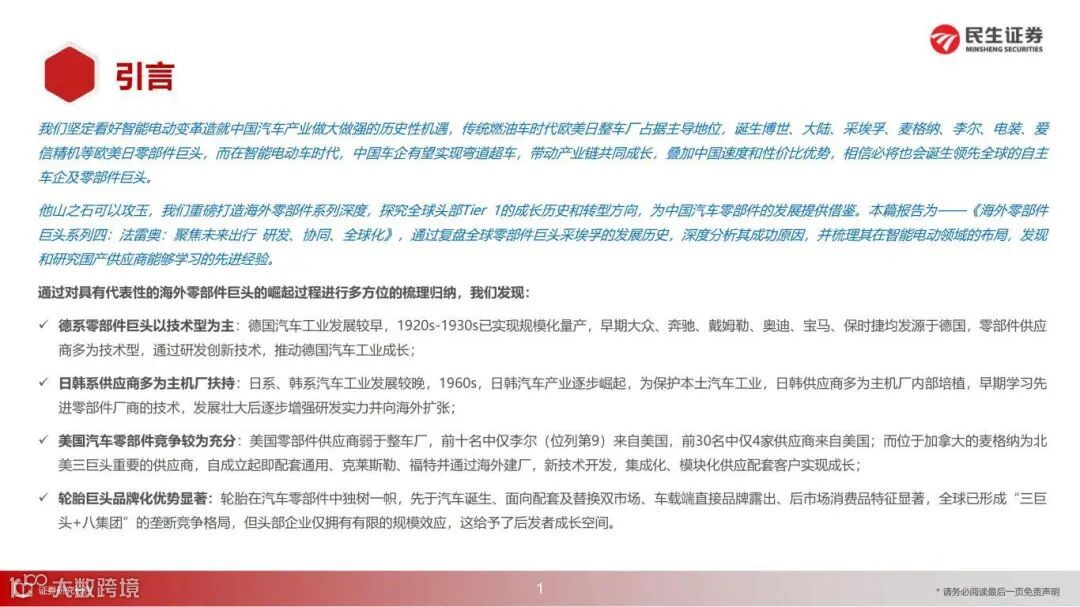 他山之石可以攻玉,我们重磅打造海外零部件系列深度,探究全球头部Tier 1的成长历史和转型方向,为中国汽车零部件的发展提供借鉴。本篇报告为——《海外零部件 巨头系列四:法雷奥:聚焦未来出行 研发、协同、全球化》,通过复盘全球零部件巨头的发展历史,深度分析其成功原因,并梳理其在智能电动领域的布局,发现和研究国产供应商能够学习的先进经验。