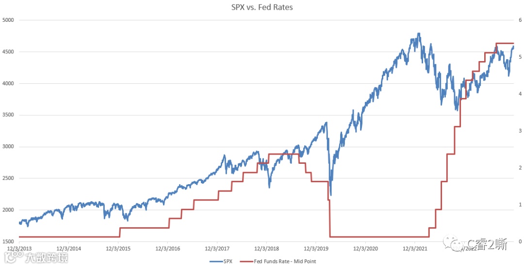 Q: one last question before I open up. So, what does fun look like for the chair of the Federal Reserve? Like, you can't go to a cocktail party and say much. Uh, what, how do you have fun? A: For me, I mean this, is really as fun as it gets, is like a really good, a really good inflation report. SPX vs. Fed Rates
