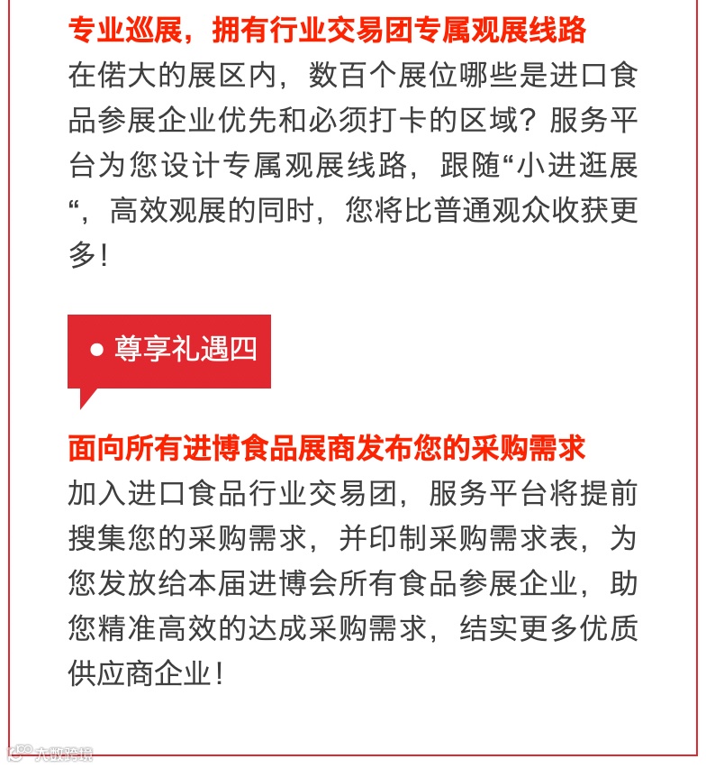 为了更好服务各行业专业观众,推进“综合展、专业办”进程,感谢专业观众5年来的关心和支持,第五届进博会食品农产品展区本次新设【进口食品行业交易团】,专业观众可通过填写“专属推荐码”(H2022025)免费加入,享受更多专业级的贵宾待遇,获得更多优质服务。