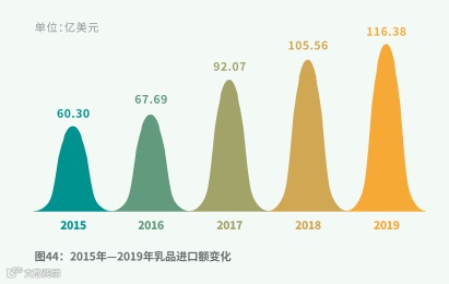 2019年,乳品进口额达116.4亿美元。与2018年相比,进口额净增长11亿美元,同比增长10.2%。2015~2019年间,乳品五年年均复合增长率达18%。