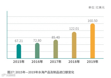 2019年,水海产品及制品进口额达160.5亿美元。与2018年相比,进口额净增长38.5亿美元,同比增长31.6%。2015~2019年间,水海产品及制品五年年均复合增长率达24.3%。