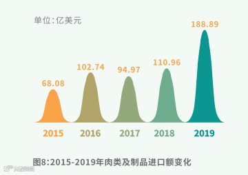 2019年,肉类及制品进口额达188.9亿美元,与2018年相比,进口额净增长78亿美元,同比增长70.2%.2015年~2019年间,肉类及制品五年年均复合增长率达29.1%。