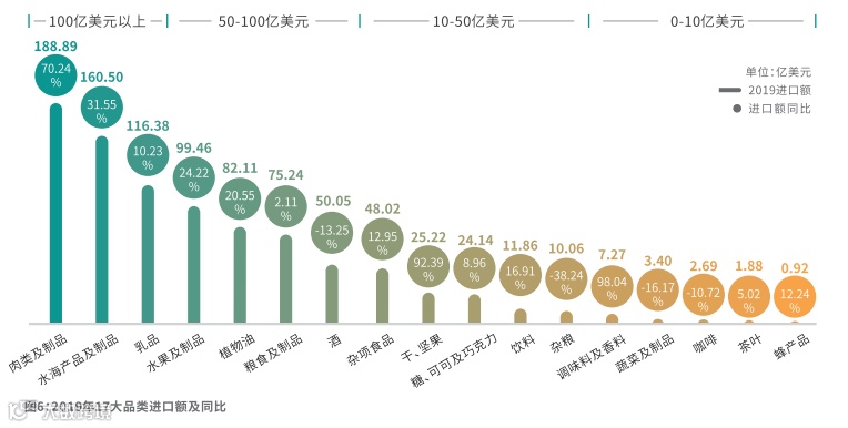 2019年,我国进口食品的17个品类中,排名前三位的品类分别为肉类及制品、水海产品及制品、乳品,进口额均超过100亿美元,分别达188.9亿美元,160.5亿美元,116.4亿美元,分别占进口总额20.8%、17.7%、12.8%。