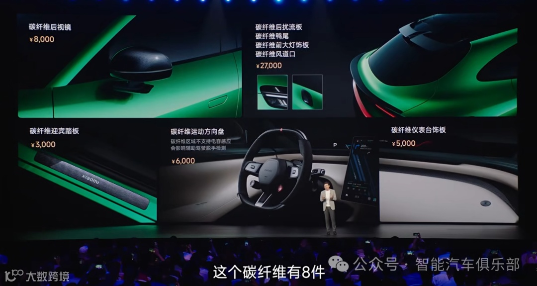 碳纤维汽车内外饰件不仅为车辆带来轻量化优势,显著提升燃油经济性与操控性能,小米YU7 Max版碳纤维选配件包含后视镜、迎宾踏板、方向盘、仪表台饰板、后扰流板、鸭尾、大灯饰板、风道口。