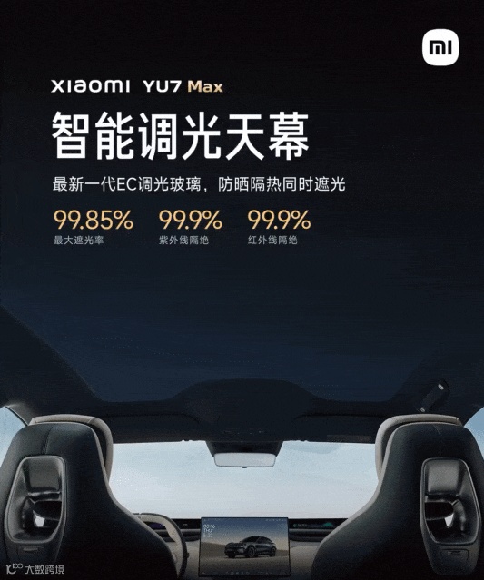 小YU7的天幕采用双层镀银玻璃,四门采用隔音棉夹层防晒车窗。据了解,睿华光电的ai调光玻璃,能在外界光线强度和车内光线之间通过微电压,快速实时调节透光率;此外,还可实现99%以上的紫外线阻隔和热量阻隔,降低车内温度上升速度。
