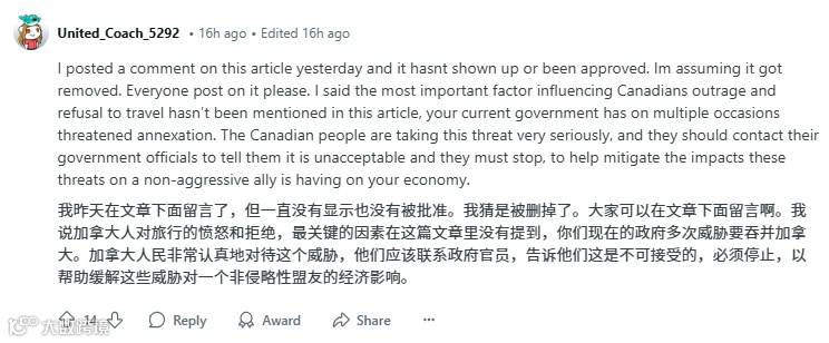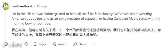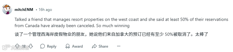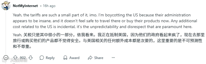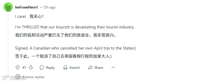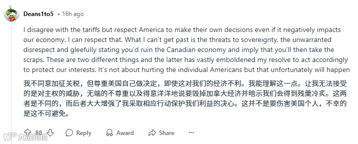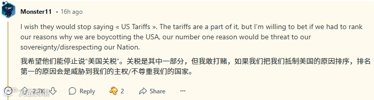 用户Monster11的发言极具代表性:「别再归咎于关税了!我们抵制美国的首要原因是主权受辱。」