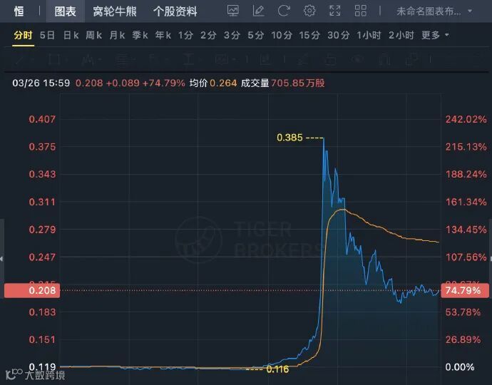 3月26日,恒大汽车港股异动,最大涨幅一度超230%。截至当日收盘,恒大汽车股价涨幅为74.79%至0.208港元/股,市值为22.6亿港元。
