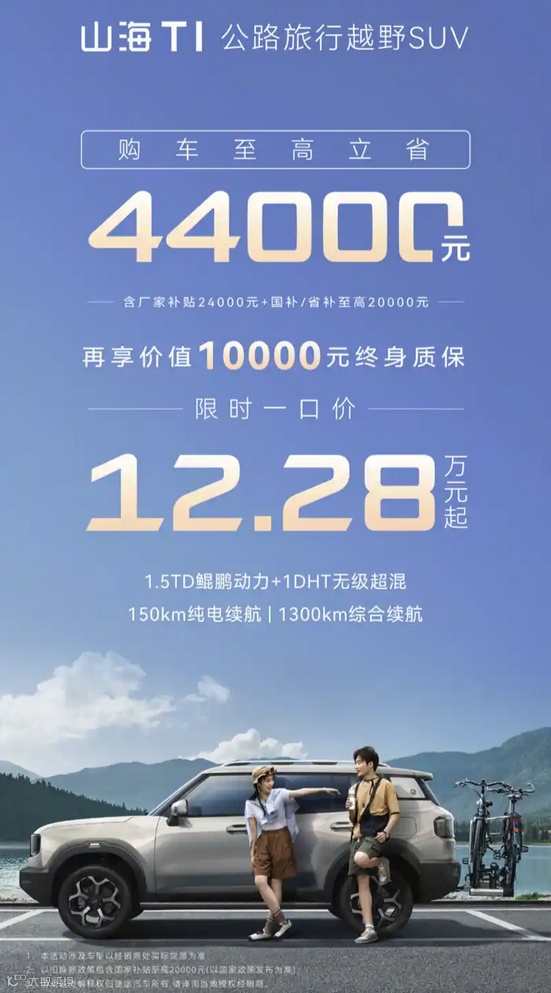 据悉,当前购车可享至高44000元现金优惠(含厂家补贴24000元+国补/省补至高20000元),以及价值10000元的终身质保,限时一口价12.28万元起。