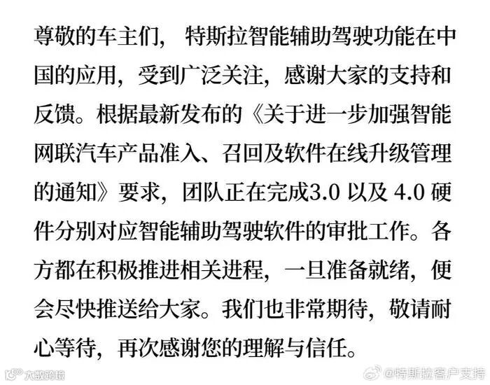 3月24日,特斯拉客户支持官微在特斯拉公司副总裁陶琳的微博评论区发布声明,回应“暂停FSD推送”消息:特斯拉智能辅助驾驶功能在中国的应用,受到广泛关注。根据最新发布的《关于进一步加强智能网联汽车产品准入、召回及软件在线升级管理的通知》要求,团队正在完成3.0以及4.0硬件分别对应智能辅助驾驶软件的审批工作。各方都在积极推进相关进程,一旦准备就绪,便会尽快推送给大家。