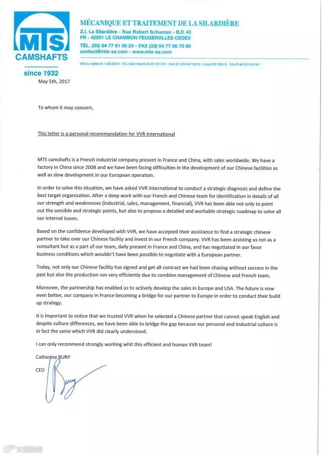 如今,双方企业合作愉快,在新合作模式的开启下不断获得了大批量的生产订单。为此,MTS集团CEO Catherine BURY女士为VVR公司书写了一封推荐信(见下图)。