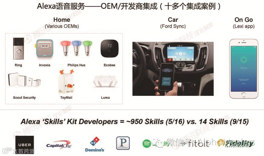 Alexa语音平台在技术上和应用上,完全可以成为家具/汽车/手机的麦克风,已经展现出类似iOS+iPhone生态的可能性: