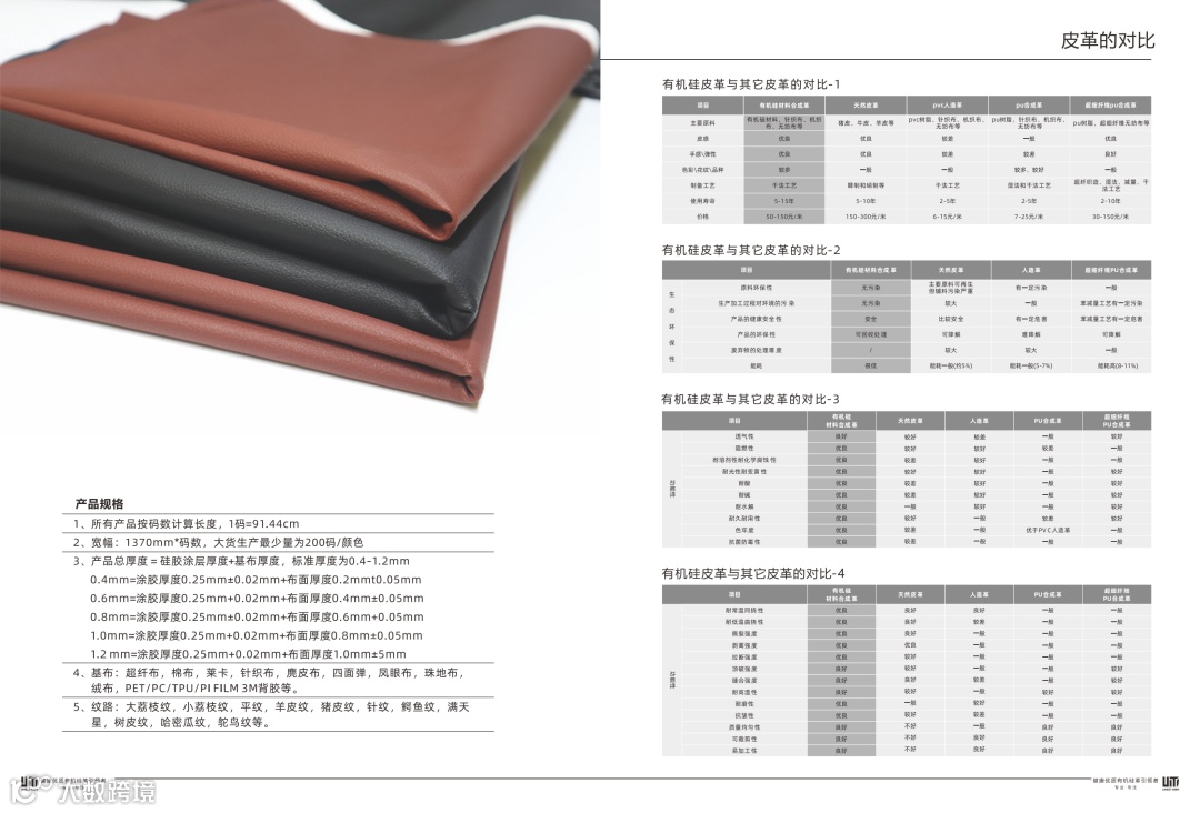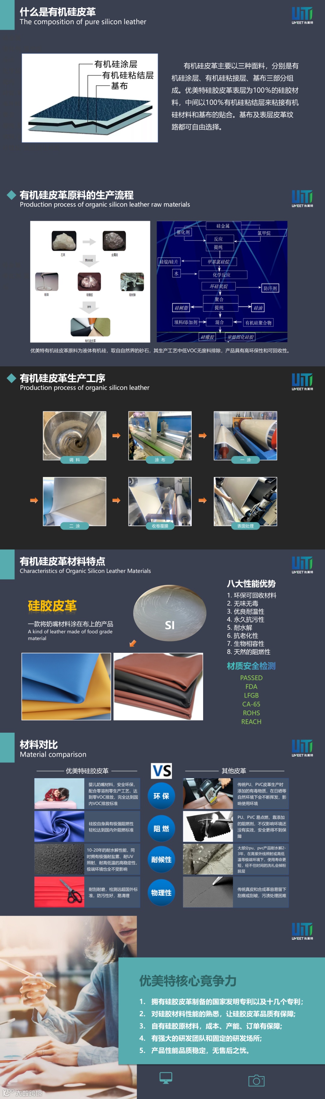 优美特公司是集研发生产一体的公司,我司研发人员一直不断探索开创无限可能,公司初期通过引用高端前沿技术于2015年投入研发硅胶皮革。它不仅能减少对动物的杀戮,还能让人们在生活中减少塑化产品的毒害,同时又能让大众享受到高品质健康耐用的皮制产品。我司致力于成为有机硅胶皮革领域的佼佼者,为行业发展做出更大贡献。