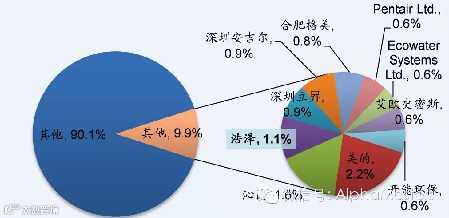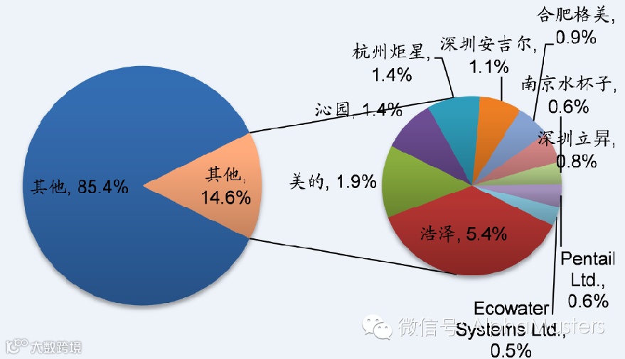 目前在净水器市场,市场参与者众多,集中度低。在家用市场,前十大企业市场份额不超过10%,排名前三的分别为美的(2.2%)、沁园(1.6%)和浩泽(1.1%);在商用市场,前十大企业市场份额不超过15%,排名前三的分别为浩泽(5.4%)、美的(2.2%)和沁园(1.4%)。