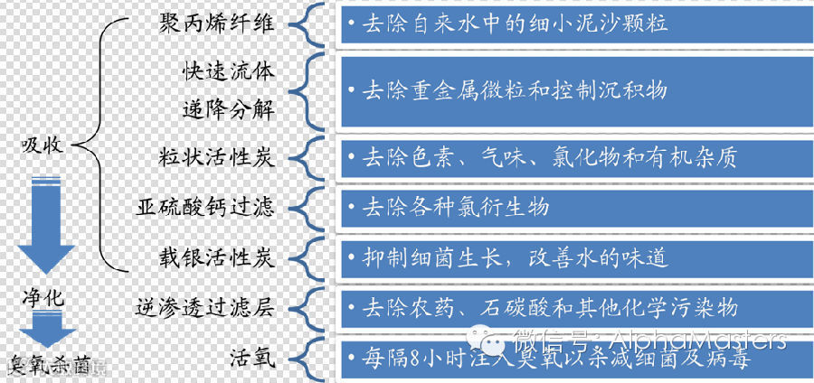 A吸收:组装及合并多重吸收过滤层,包括预净化过滤、快速流体递降分解、亚硫酸钙及特级粒状活性炭过滤层,以滤去水中可能致癌的有害物质如微量氯化合物以及亚硝酸盐化合物等。