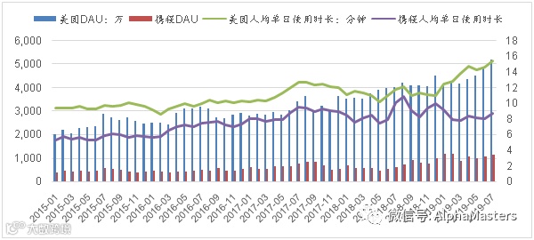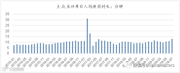 大众点评在获得一家独大的地位后并没有停下脚步,查看餐厅信息和优惠券只是基础功能,大众点评正在打造更加内容化的社区来增加用户黏性,单日人均使用时长呈现出平稳增长趋势。