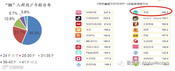 美团相对携程的另一个优势是随用户成长占领高端份额。美团无疑是懒人经济的代表,而懒人群体的组成中有一大半是Z世代(95后和00后),因此美团在年轻用户的渗透率排在第11位,活跃渗透率TGI达到166,也即是美团在年轻用户的渗透率是美团在全网渗透率的1.66倍。