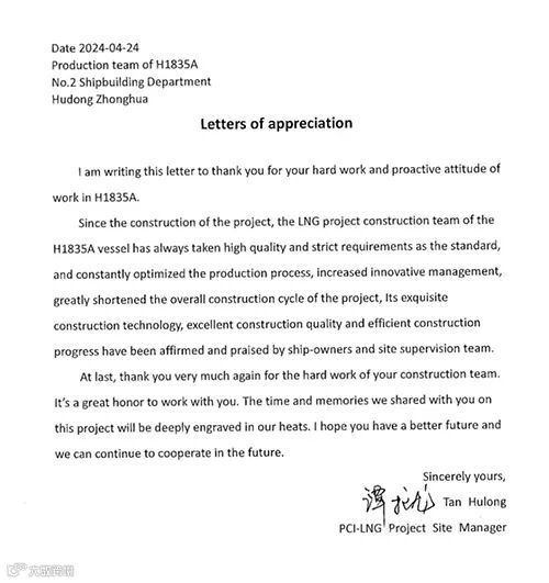 4月24日,公司圆满完成中远海运中石油项目LNG船(H1835A)“二合一”试航。该船仅用4.5天试航凯旋,再创大型LNG船试航世界最快纪录,标志中国大型LNG船建造效率达到世界领先水平。