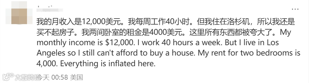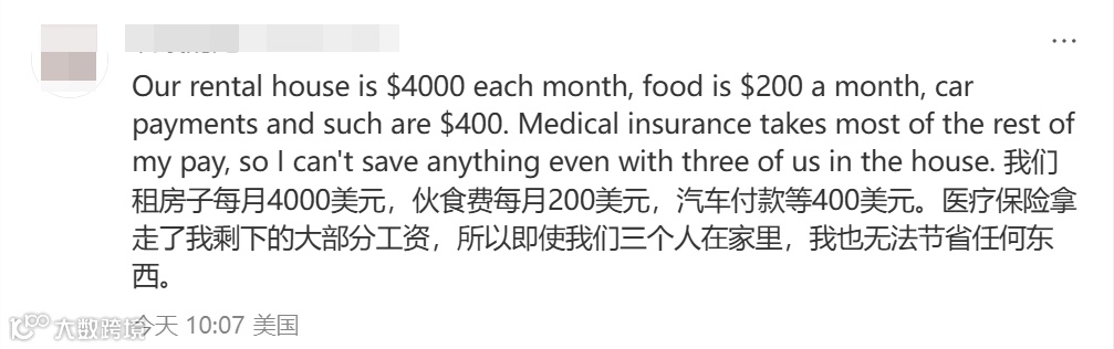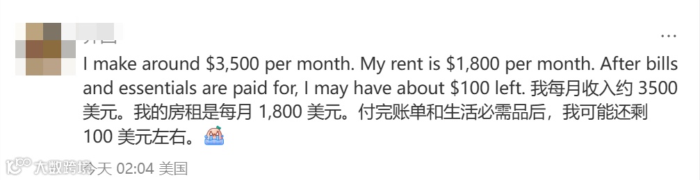 月薪2000美元的人交完账单只剩300刀生活费,税后2700美元的说房租水电直接吞掉1800刀。