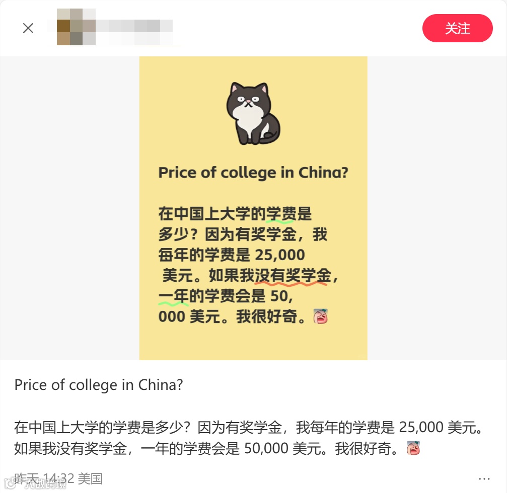 中国网友说国内大学一年学费5000到8000人民币(约700到1100美元),高一点的一年一万多人民币,也不到2000美元。