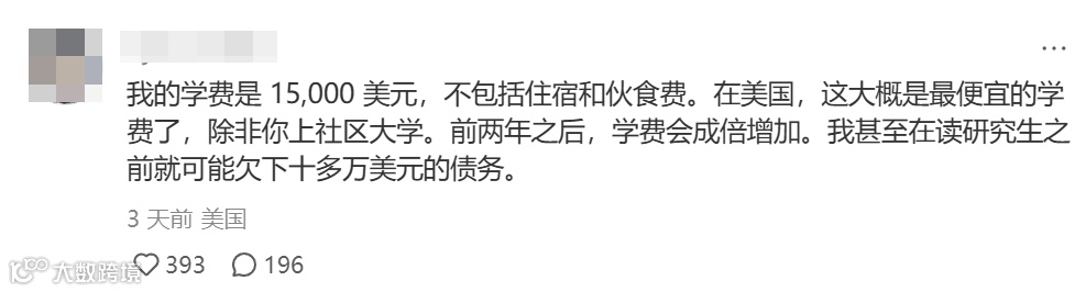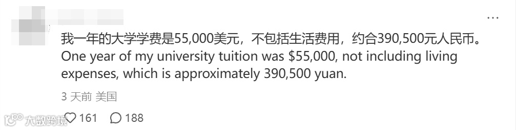 更惨的还有一个美国女生,她在中国看到法学院一年不到1000美元的学费,彻底崩溃,因为她在美国读法学院已经欠了45万美元的贷款,相当于329万人民币。