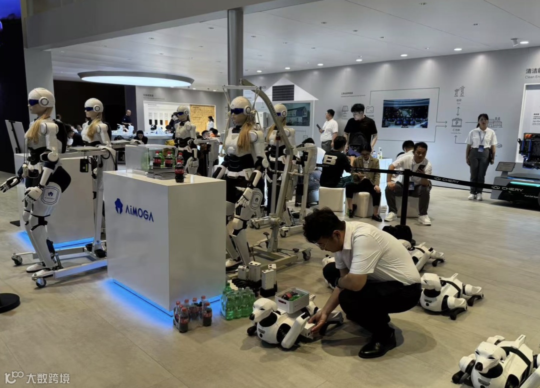 奇瑞汽车展台的“机器狗军团”也成为了全场焦点。这支由十几台智能机器狗组成的特殊队伍,不仅能够完成整齐划一的集体舞蹈表演,还具备实用的服务功能。现场工作人员向观众演示机器狗完成递送矿泉水、搬运小型物品等任务。