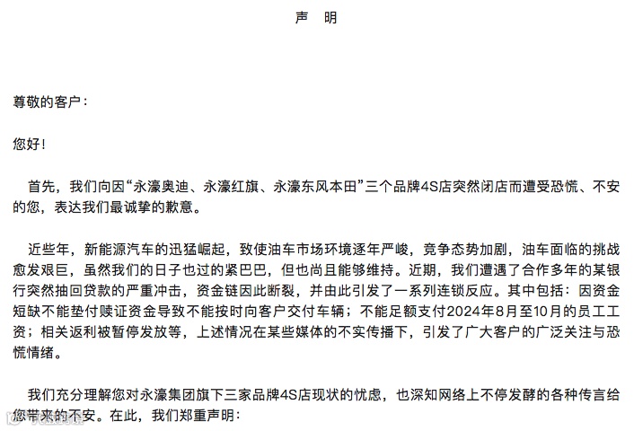 针对“天津最大奥迪4S店闭店”事件,11月17日晚间,天津永濠集团官方发布声明。官方表示,天津永濠集团向因“永濠奥迪、永濠红旗、永濠东风本田”三个品牌4S店突然闭店而遭受恐慌不安的用户致歉。另外,天津永濠集团强调,关于“永濠集团老板王学军已携款潜逃至国外”、“4S店将库房车辆全部转移”、“客户在永濠奥迪交了80万提不了车”等传言均为不实之词。官方解释,王学军并未涉及任何违法行为,更不存在“卷钱跑路”的情况。