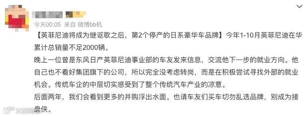 此外,还有微博认证的汽车博主也发文称,一位东风日产英菲尼迪事业部的车友向其透露,在积极尝试寻找外部的就业机会。这些消息结合在一起也引发了大量网友的讨论。有网友评论表示,日系车的寒冬来了。也有网友评论指出,现在国内车市卷的太厉害了。
