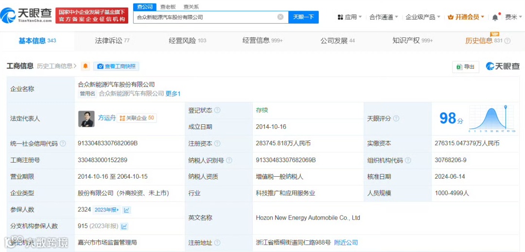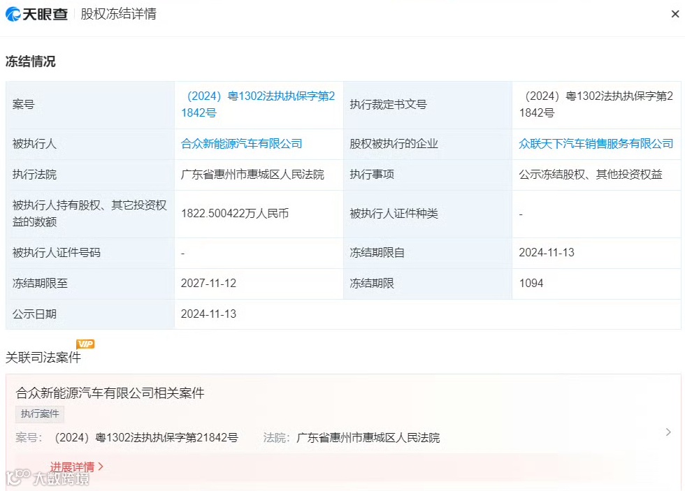 近日,据天眼查信息显示:11月13日,哪吒汽车母公司合众新能源汽车股份有限公司所持1822万股权被冻结。股权被执行的企业为众联天下汽车销售服务有限公司,冻结期限自2024年11月13日至2027年11月12日,执行法院为广东省惠州市惠城区人民法院。值得一提的是,在今年2月的时候合众新能源汽车股份有限公司就已遭到股权冻结,数额高达1000万人民币,股权被执行的企业为桐乡合众汽车销售有限公司,冻结期限自2024年2月6日至2027年2月5日。