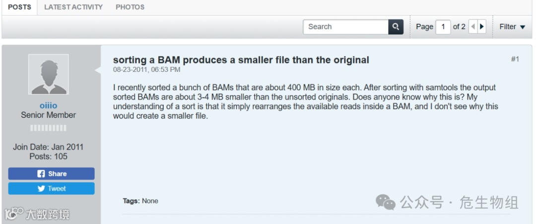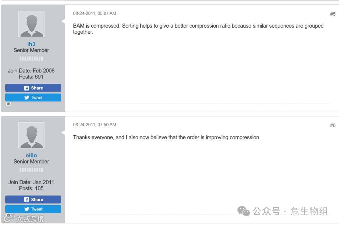 但是受限于资料有限,我暂时没有找到关于BGZF压缩算法相关的数学模型。不过在搜索BGZF算法的过程中,我发现国外有学者也发现了samtools对bam文件排序后会减少文件的大小。并且samtools软件的开发者李恒也给这位国外学者做出了简单回复,大概意思是说由于在reads排序前,BAM文件中不同reads在染色体上的分布和坐标不同,排序前的bam文件中的reads是散乱分布。而排序后的reads做到了在基因组上的位置按照染色体和坐标的顺序排序,这样sort后的bam文件中相邻reads的一定在染色体的临近位置。这样使得BAM文件中每个相邻的压缩块更相似。我理解的是文本空间经过排序后的熵减少了,从而使得储存空间占用更小。