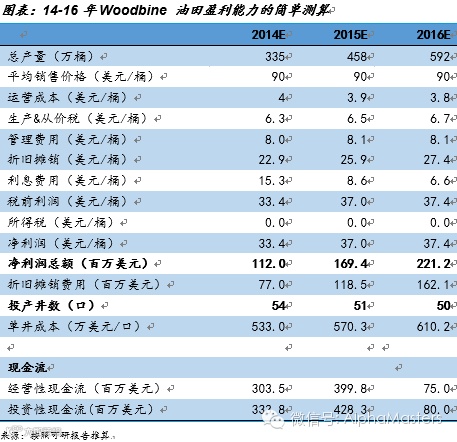 假设公司14-16年分别打井54、51、50口,根据我们的测算,Woodbine油田14-16的产量分别为335万桶、458万桶和592万桶,产量年复合增速33%。可以实现净利润1.1亿美元、1.7亿美元、2.2亿美元,利润复合增速超过40%。