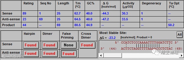 PCR本质上也是一种化学反应。如果常做PCR的朋友们应该有很深刻的映像:当一对引物被primer程序设计好后,都会给出多个ΔG。例如下图中我随便找的一对引物,在表格中各自有一个ΔG,这个ΔG分别对应它们的最小ΔG,代表的是当前引物与模板上这段引物对应的正确位置的结合能力。(因为ΔG是反应化学反应的方向的,引物与模板的结合与不结合就是两个对立的化学反应方向)因此,ΔG小于0,代表引物在PCR过程中能够与模板结合。但是只有这一个ΔG远远不够。因为在真实的PCR反应系统中,还有其他变量与模板的特征片段争夺这段引物。