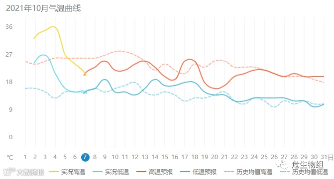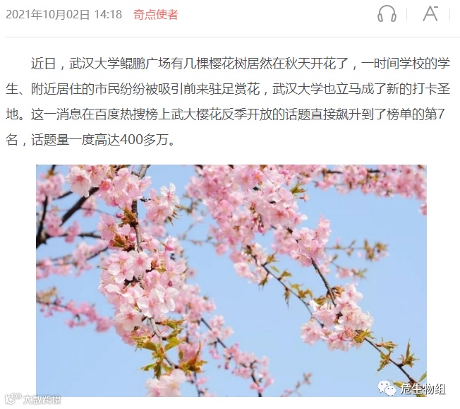 事实上,我在国庆前几天就注意到了气候的异常。记得有一天晚上在食堂吃完晚饭后,从园区的大路走回实验室,在路途中偶然发现樱花树开花了。在后面的几天,我观察到那几颗樱花树开的花越来越多。我特意还在网上查了一些新闻,果然!不仅仅是园区内樱花开了,武大的樱花都开了。另外,我还查阅了武汉市近期气温数据。数据也显示武汉在国庆前中期最高气温都超过了30度。