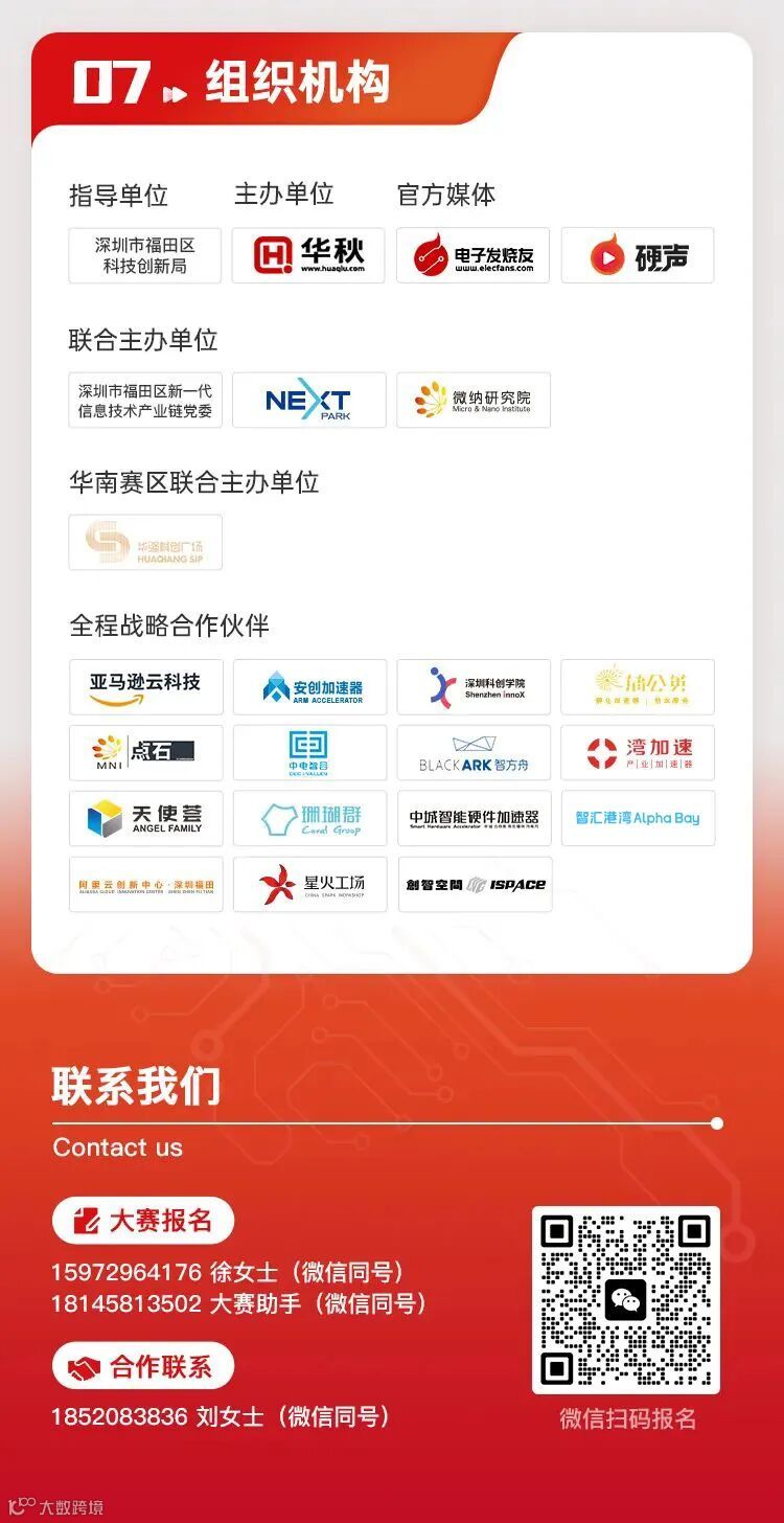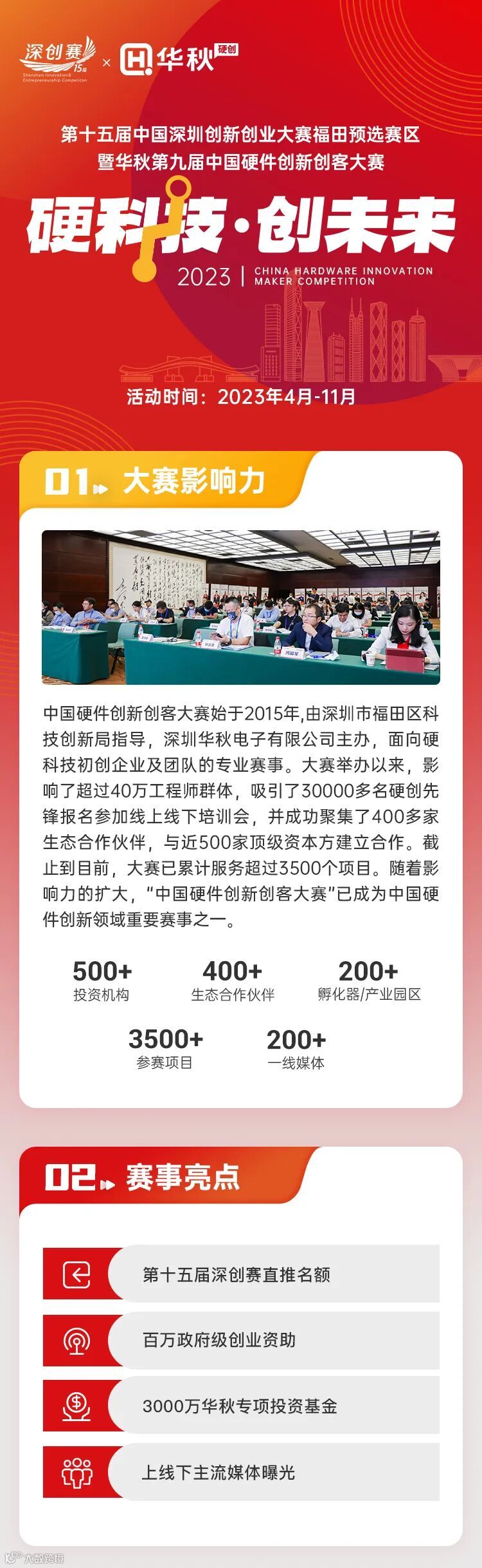 2023年华秋第九届中国硬件创新创客大赛作为第十五届中国深圳创新创业大赛福田预选赛区,同步启动项目招募工作,助推硬科技创新事业的发展,为中国智造贡献力量。