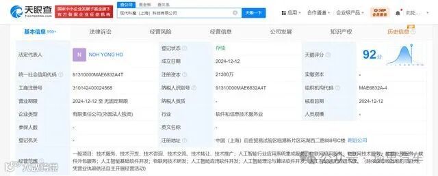 天眼查App显示,近日,现代科魔科技有限公司成立,法定代表人为NOH YONG HO,注册资本2.13亿人民币,经营范围含人工智能行业应用系统集成服务、物联网应用服务、数据处理服务、人工智能基础软件开发、人工智能应用软件开发、人工智能理论与算法软件开发等。股东信息显示,该公司由现代自动车株式会社全资持股。