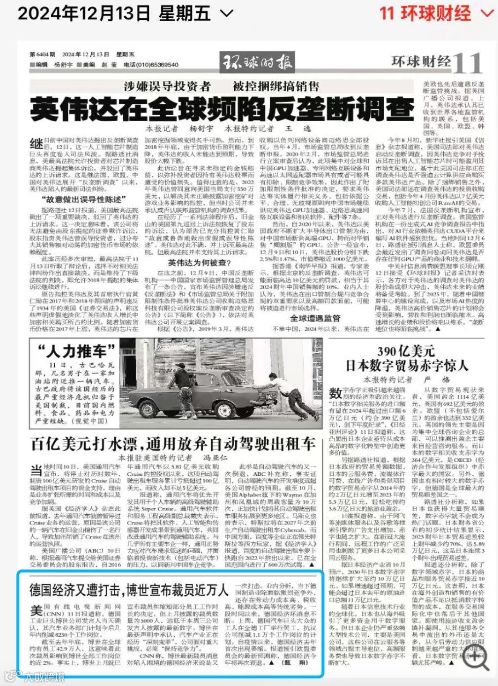博世最新裁员消息对陷入困境的德国经济来说是又一次打击。业内分析,当下德国制造业除面临激烈竞争外,还存在劳动力成本高、税收高、能源成本高等传统劣势。一段时间以来,德国经济坏消息不断。