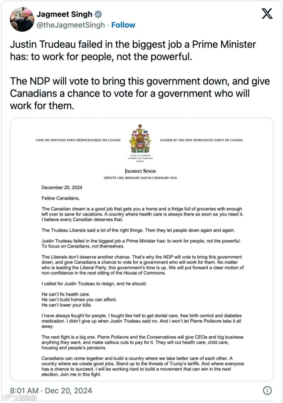 新民主党领袖辛格突然宣布,要给特鲁多政府投不信任票。