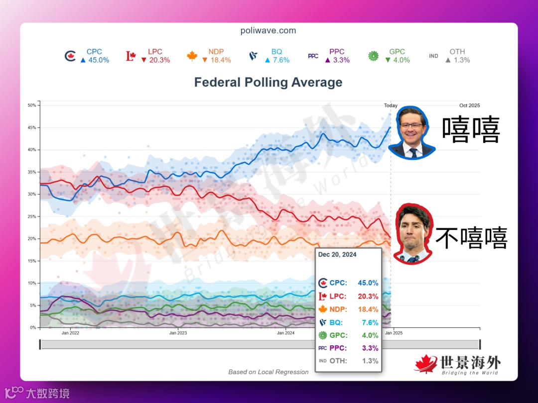 最新民调上,保守党一路高涨,支持率高达45%,而特鲁多率领的自由党,支持率自2022年开始,就一路下跌,已经低到20.3%了。