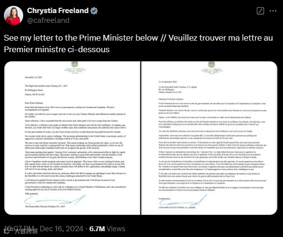 这位被视为特鲁多政府「定海神针」的重量级人物,选择在秋季经济报告发布会当天「宣布裸辞」,这一举动不仅打了特鲁多一个措手不及,更像一记重锤,敲响了特鲁多政府的丧钟。