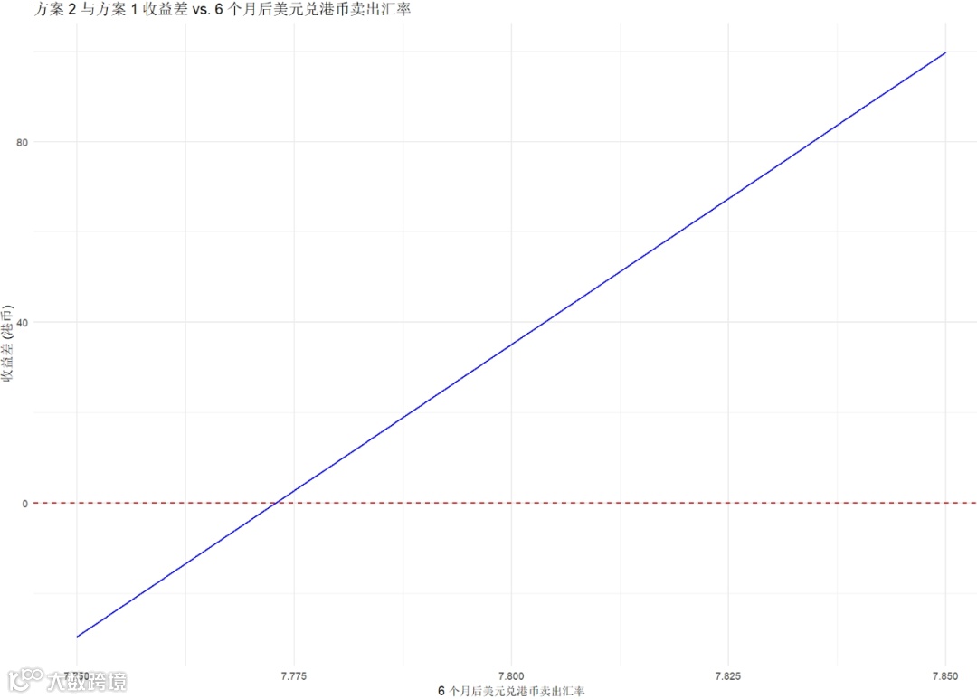 title = "方案 2 与方案 1 收益差 vs. 6 个月后美元兑港币卖出汇率",
