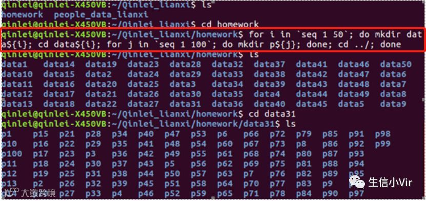 按enter执行,然后ls查看一下是否新建成功,然后再cd到任意一个data 查看是否有1到100个文件。