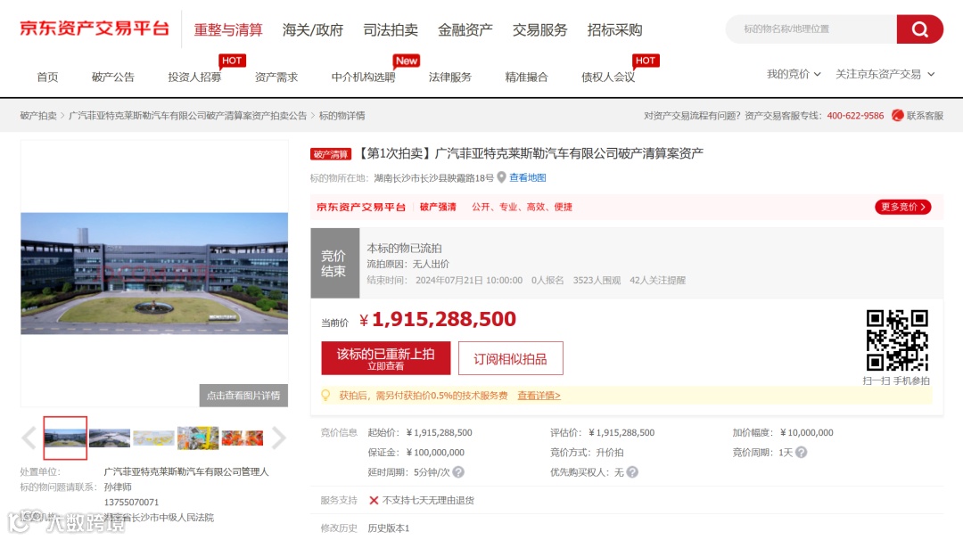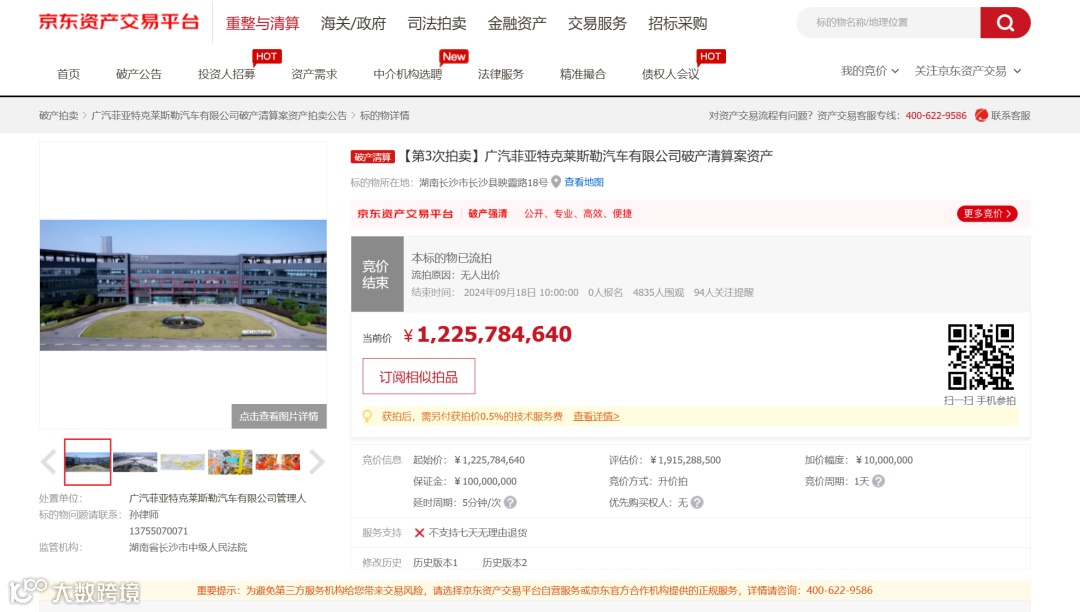 9月18日,广汽菲亚特克莱斯勒汽车有限公司(下称“广汽菲克”)破产清算案资产拍卖再度流拍。京东拍卖平台显示,广汽菲克长沙工厂及附属的建筑物、机器设备等核心资产,因无人出价再度流拍,这是其第三次拍卖,拍卖价为12.25亿元,本次拍卖共有94人设置关注提醒,4835人围观,但无一人报名,最终于9月18日10:00结束,再次以流拍告终。