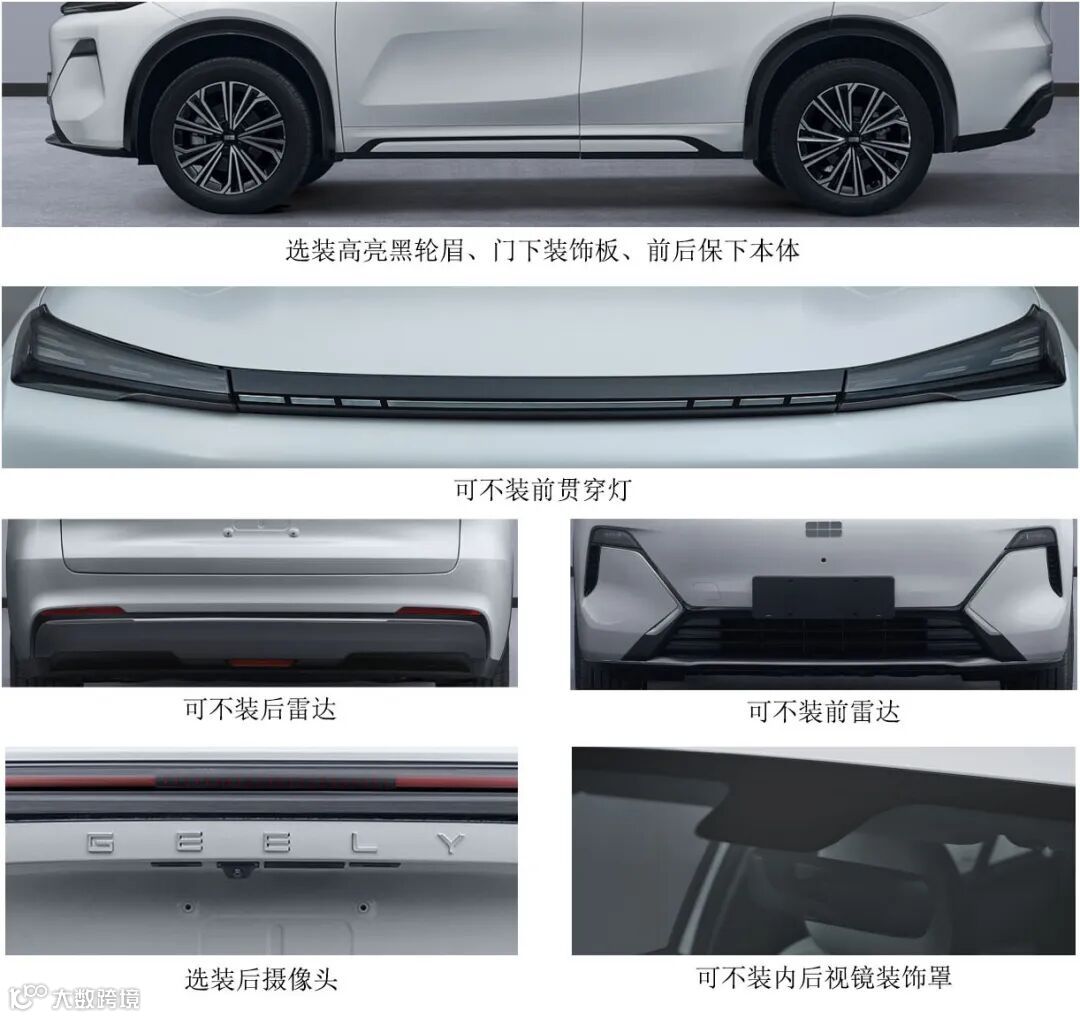 在最新一期的工信部申报目录上,我们获取到了吉利银河全新车型——银河星舰7的申报图,新车前脸设计风格与吉利银河E5相近,搭载1.5L插混动力系统,定位中型SUV。