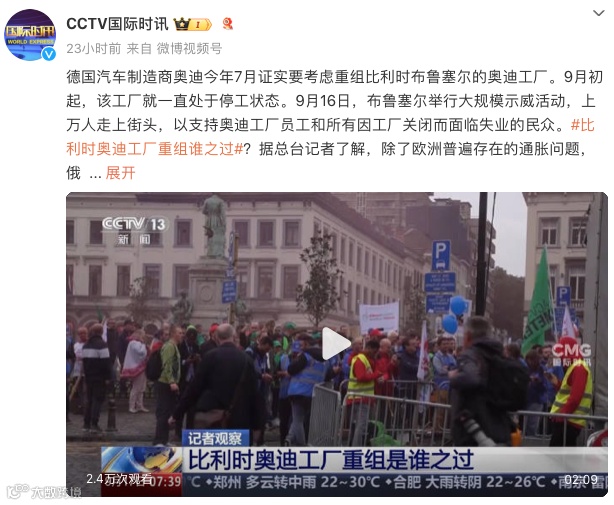 据央视新闻报道,因德国汽车制造商大众汽车集团旗下奥迪品牌对其位于比利时的布鲁塞尔工厂进行重组,该工厂从9月初开始处于停工状态,工人面临失业,由此引发游行示威。