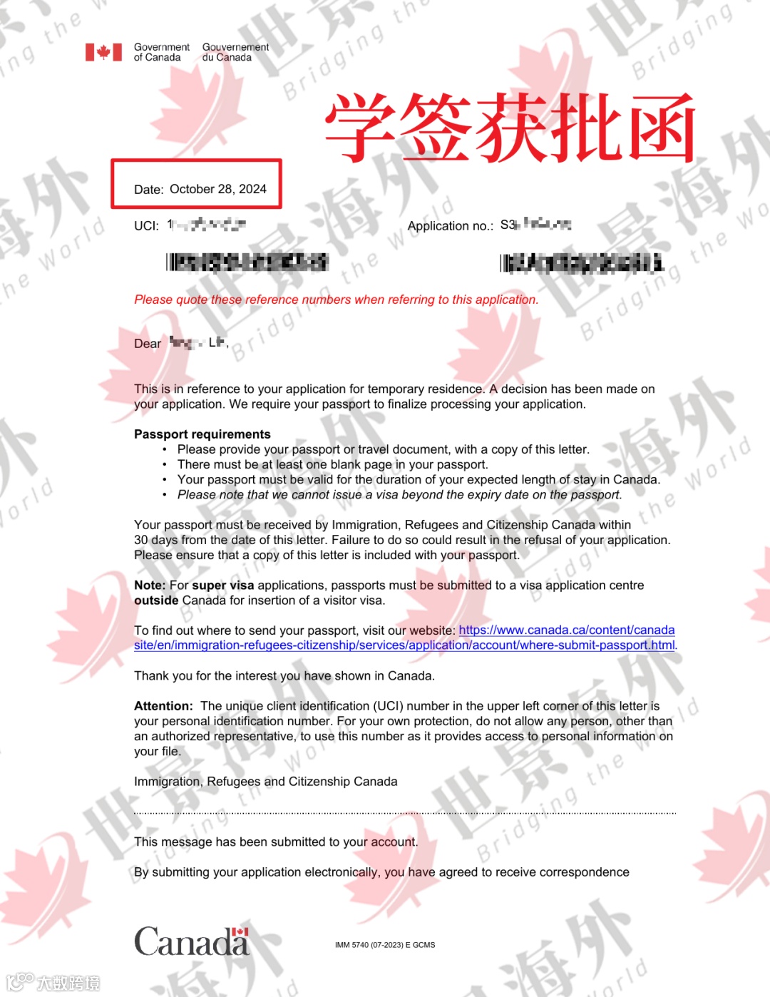 我们世景海外在10月9日为L先生递交了申请,没想到短短11天后的10月28日,就收到了学签获批的通知,