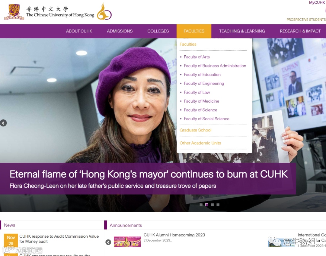 香港中文大学|The Chinese University of Hong Kong|CUHK。这是香港三大名校之一,全球高校QS排名位于前50。香港中文大学官网点进去之后在导航栏找到FACULTIES然后选择你想进入的基础学科,再等待页面跳转,进入你想进入的学院。等待二次跳转页面出现后再进入你想进入的Research Center最后你可以看见每个Research Center下的学科组带头人信息。不过香港中文大学官网首页有一个醒目的大字,可以选择进入简体中文或繁体中文的页面。这一点非常人性化,充分为内地学生、国际学生提供了便捷通道。