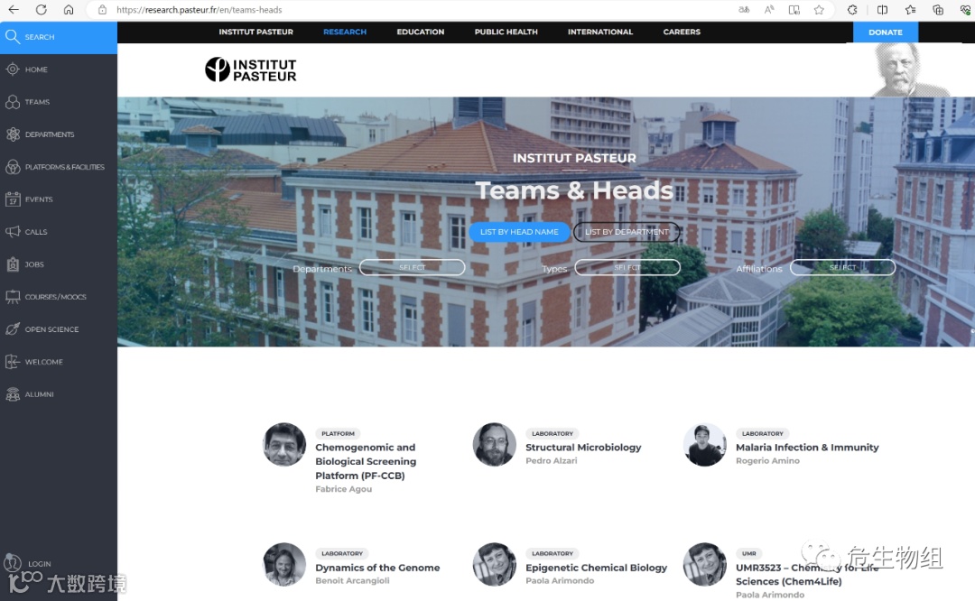 Institute of Pasteur|巴斯德研究所|法国。和Sanger研究所类似,巴斯德研究所在全球不同国家有分所。不过我曾浏览过巴斯德所法国总部的官网。巴斯德所的官网是我访问过的最简单的网站。进入主页后侧面直接弹出导航栏,无论你选择TEAM还是DEPARTMENT都可以进入查看研究所内各团队的信息。但是巴斯德所是研究病毒学和微生物学非常著名的研究所,这个研究所想做博后一定要眼疾手快。我之前给巴斯德所发套磁邮件,虽然也得到了很多回复,但是基本上都是回复我博后招满了,或者是有马上要离开的博后,但是还要等半年左右。我猜可能是因为本身全球以微生物学或病毒学为主要研究方向的单位相比于其他学科少,加上巴斯德所是老牌微生物领域的顶尖研究所,所以微生物学或病毒学出身的博士都会首先考虑巴斯德所。所以巴斯德所的竞争相对激烈。