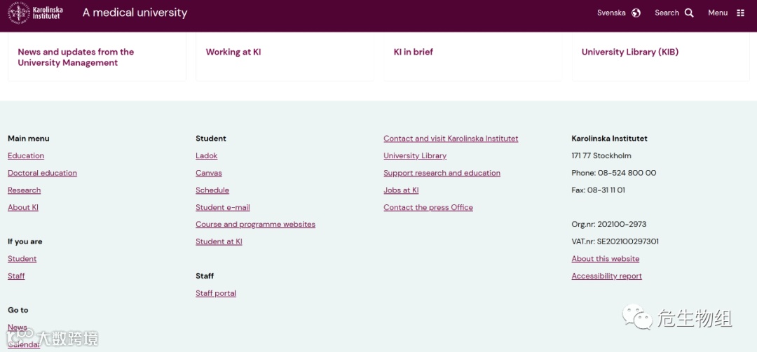 Karolinska Institutet|卡洛琳斯卡医学院,这是位于瑞典的顶尖医学院。这所医学院也接收玛丽居里项目全奖博后。当你进入该医学院主页时,你需要下拉页面至底部或者点击右上角的Menu菜单栏进入导航栏,你可以选择进入Research一栏跳转至新页面再从新页面中找到Research Centers查询了解相关课题组。你也可以进入Staff portal栏目直接跳转至可以查询招聘信息的页面,卡洛琳斯卡医学院有一个人性化的博后招聘流程,你可以将你的求职简历通过招聘栏目发送给卡洛琳斯卡医学院的人事,然后人事帮你转发你的简历,如果有对你感兴趣的教授,他们会直接联系你。我个人不建议通过这种方式进去,因为我试过。当你填写你的求职简历时前几页还可以用英文正常填写,到最后几页你会发现全是瑞典语,完全看不懂,而且网页的翻译功能还无法用。所以我后来也放弃继续用这种方式浪费时间了。