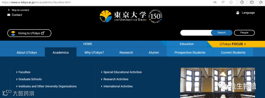 The University of Tokyo|东京大学。这是亚洲的顶尖大学之一,全球高校QS排名位于前50。东京大学的官网非常长。但是这所学校如果想进入学院教授信息栏,就不是点击Research导航栏了,而是点击Academics中的Faculties栏目进入你想进入的学科,然后再逐级进入可以查看学科下面学院的名字。但是到了这一步距离查询学院内教授名字还有一段距离,因为你会发现每一个学院的名称只是文本文字,并没有任何超链接可以跳转进入学院内页面。我曾经在东京大学的官网上找了很久也没有找到如何进入学院内网页。后来我自己发现了一个相对高效的方法。例如东京大学的生物信息学部门的全称是Department of Bioinformatics and Systems Biology and Department of Biological Sciences,我将这个全名复制,然后在Bing的搜索引擎中搜索The University of Tokyo Department of Bioinformatics and Systems Biology and Department of Biological Sciences。然后通过这种手段直接进入学院的子网页。就能一目了然全部教授的信息。