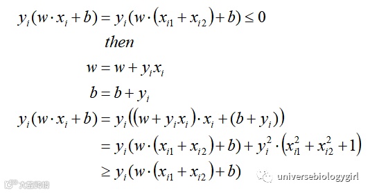 3.如果yi(wxi+b)<=0 w=w+yixi b=b+yi 返回2,直到没有误分类点。这里,解释一下为什么令w=w+yixi;b=b+yi可以纠正误分类点:由于出现了yi(wxi+b)<=0,才判断产生了误分类点。以我们前文为例子,根据矩阵内积有: