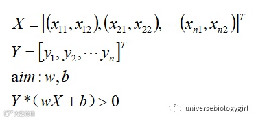 读完前面你可能似懂非懂,懂的是你知道这玩意儿是干啥的,不懂的是你不知道它咋干的。我们继续探究它咋干的,现在我们先定义一个训练数据集。假设有如下训练点集X及其对应标记Y,通过感知机模型找到两个参数w与b使得满足如下: